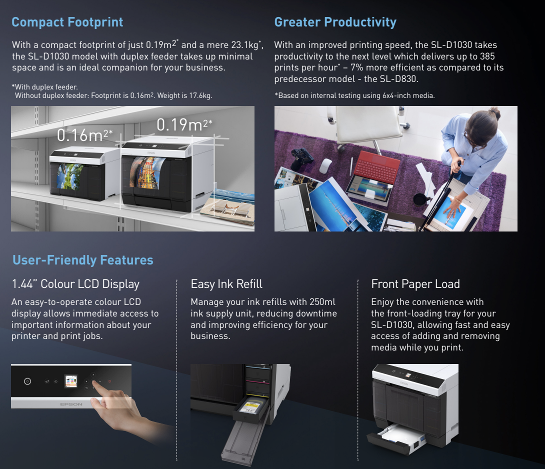 - Dirancang sebagai printer foto kompak untuk kebutuhan photo kiosk, studio foto kecil, dan event printing.