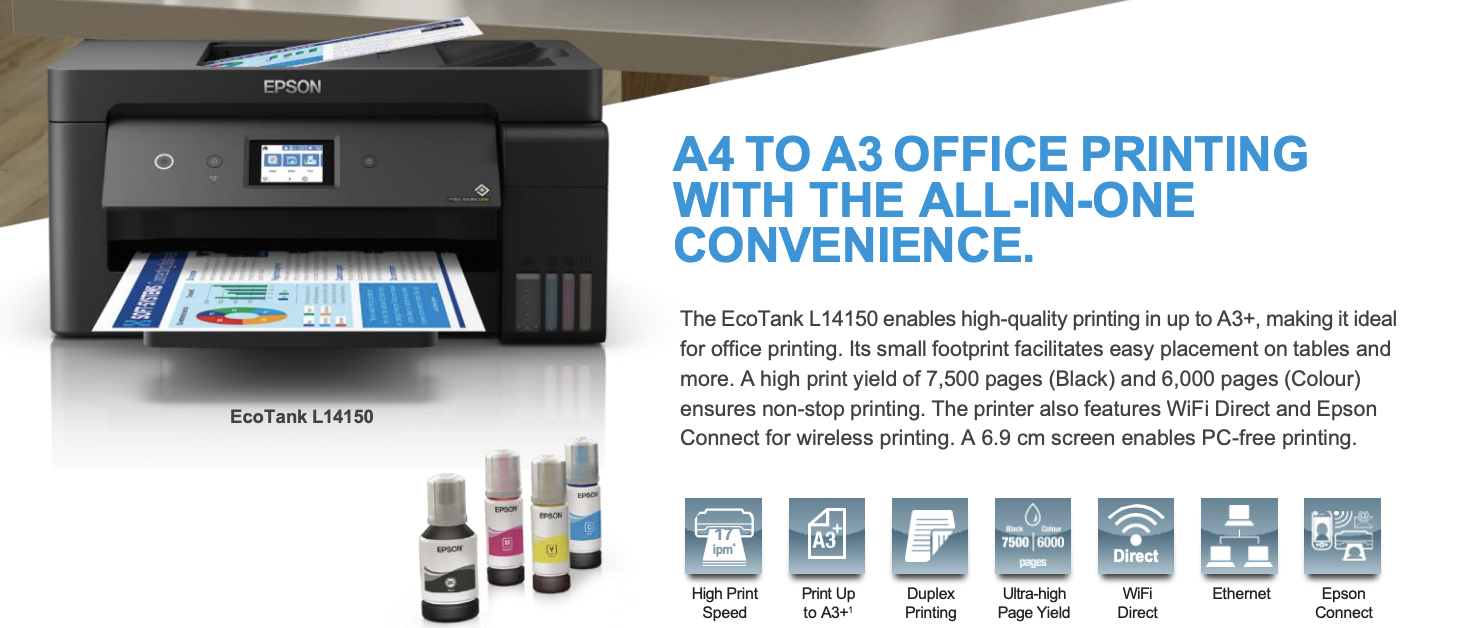 - L14150: menonjol sebagai solusi wide-format ringkas dengan auto-duplex dan konektivitas Epson Connect. (Sumber: Epson Singapore)