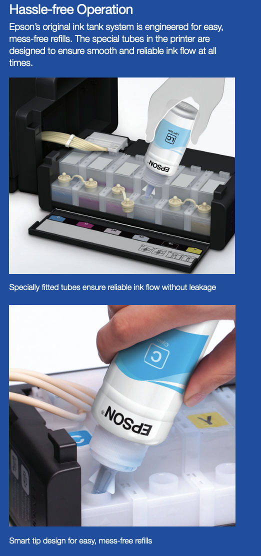 - L1800: Dirancang untuk hasil cetak foto yang kaya warna dan gradasi halus berkat 6 warna. Sangat baik untuk cetak foto A3+ dan tugas yang menuntut reproduksi warna.