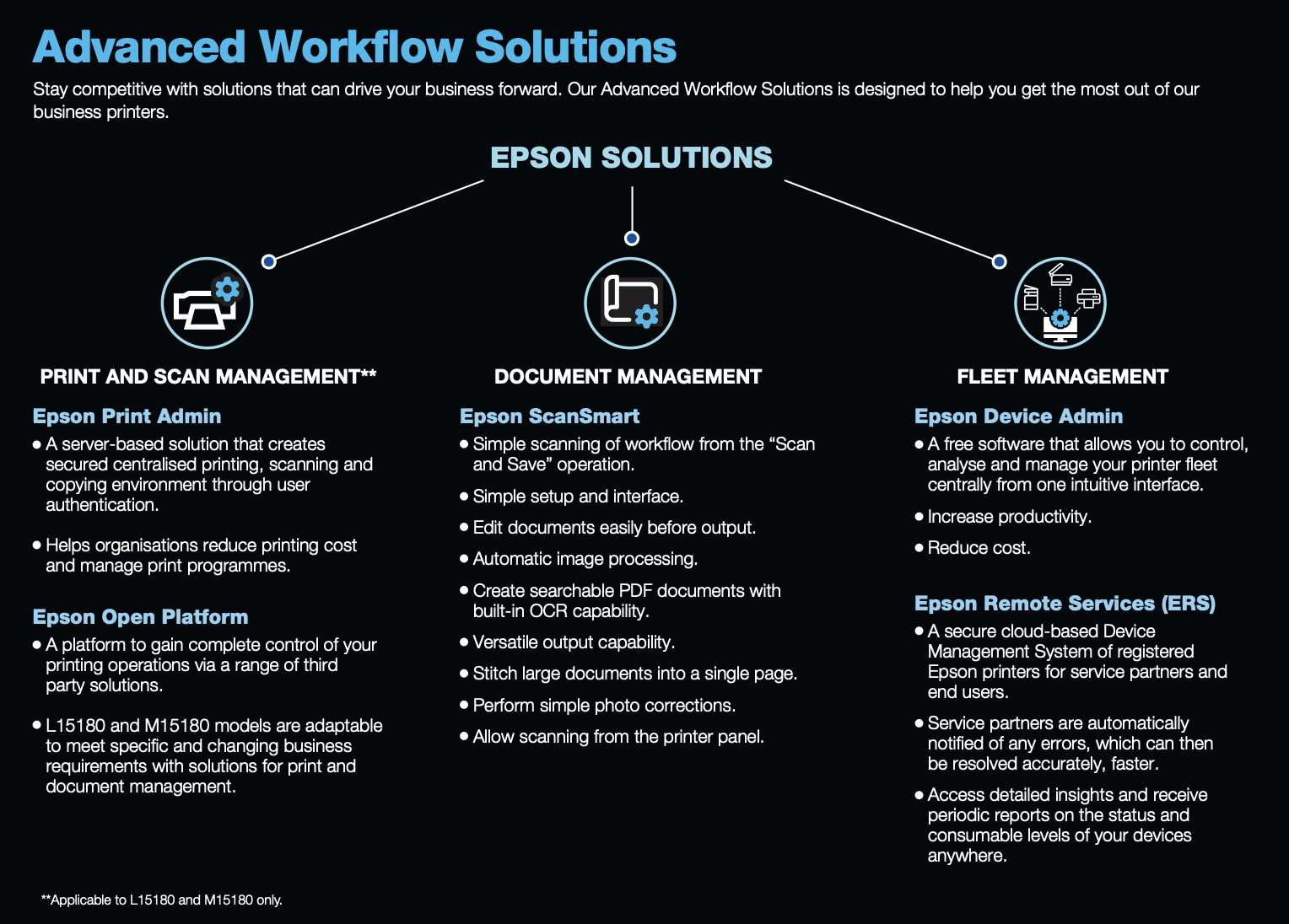 - L15180: biasanya dilengkapi fitur konektivitas modern (Wi‑Fi, mobile printing), opsi keamanan (pengelolaan akses) dan fitur manajemen cetak untuk lingkungan bisnis.